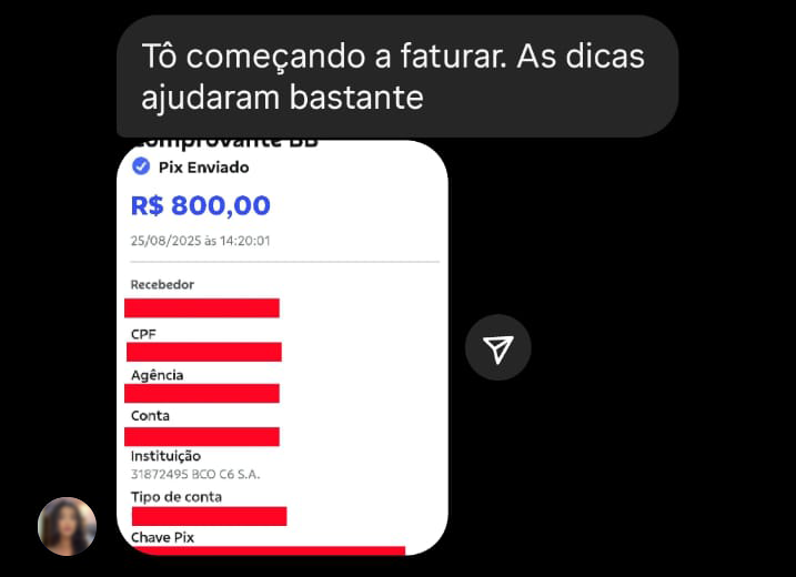 Nossos alunos mais dedicados conseguem os primeiros clientes entre 15 a 30 dias. O João Lucas, por exemplo, faturou R$ 1.000 no primeiro mês seguindo exatamente o que ensinamos. Claro que os resultados dependem da sua dedicação e aplicação das estratégias.